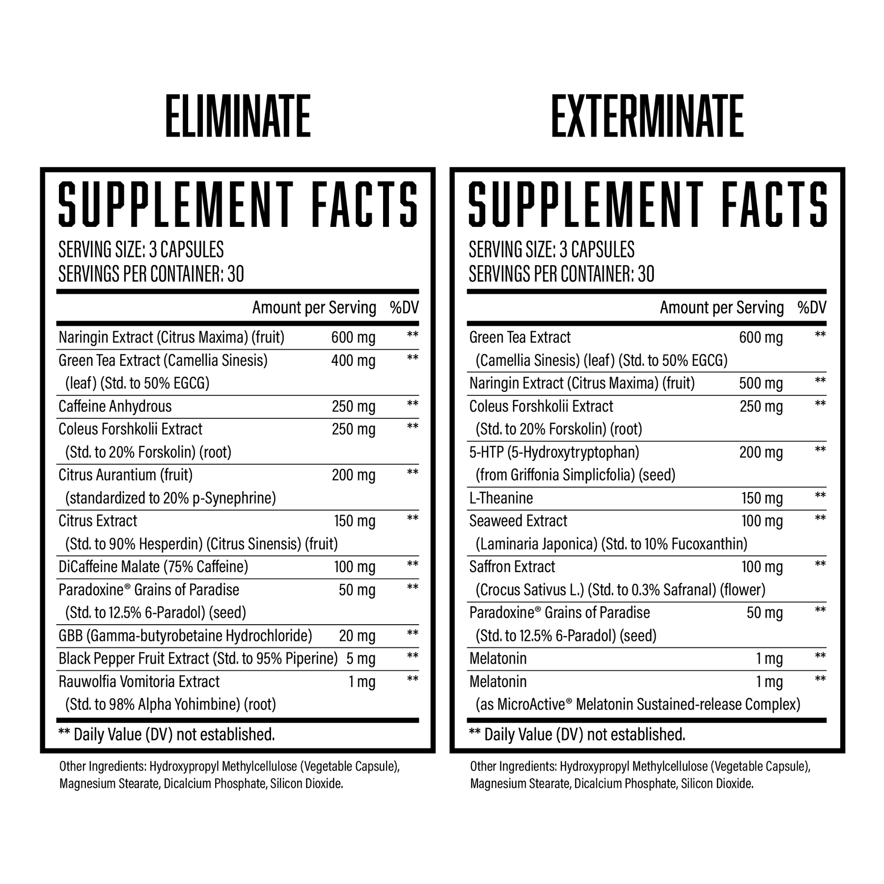 Take two capsules of Eliminate and two capsules of Exterminate in the morning. Then, 4 to 6 hours later, take another two capsules of Eliminate and one capsule of Exterminate. Make sure to safely assess your tolerance by taking one capsule of Eliminate and one capsule of Exterminate. Do not combine these products with any other stimulant-based supplements. Do not take these fat burners in the evening, as they can interfere with your ability to fall asleep when taken too close to bedtime.